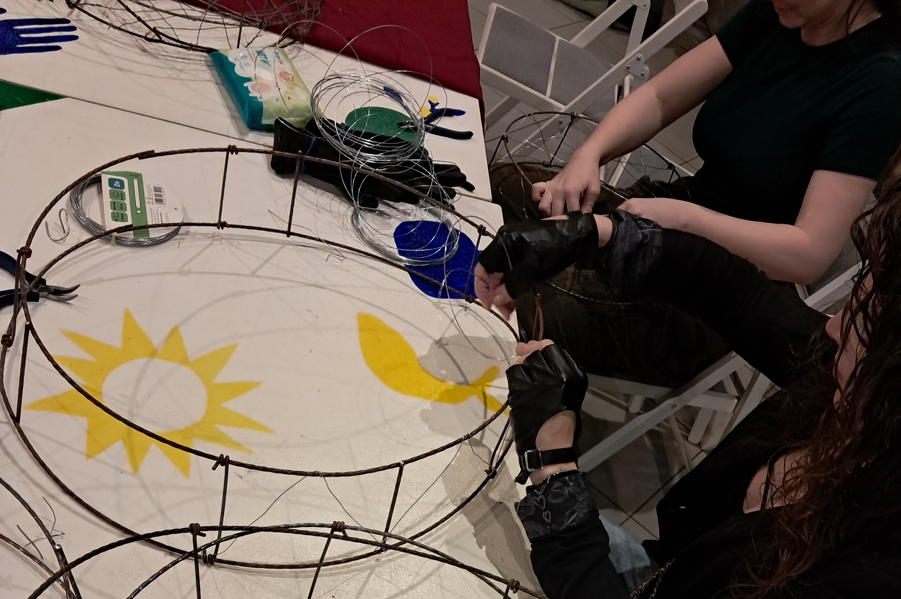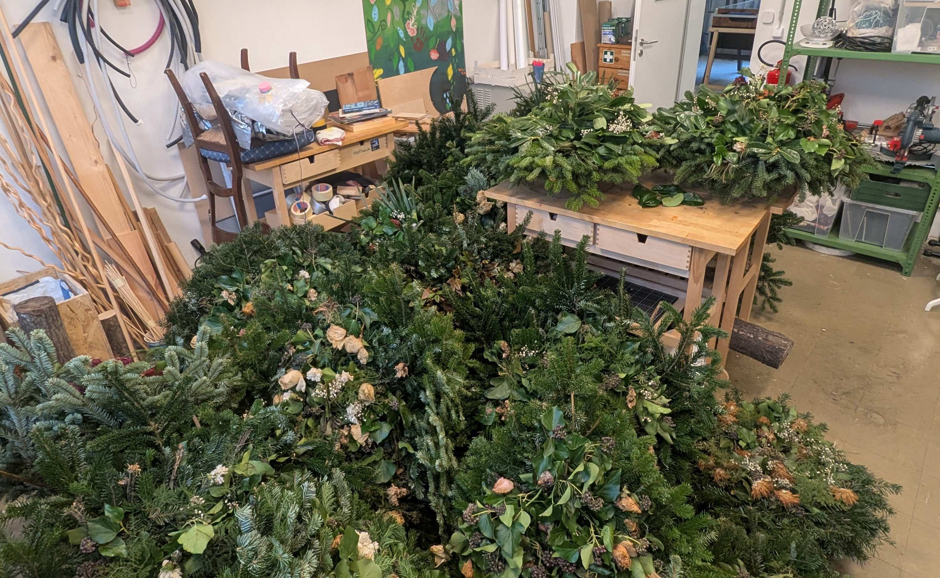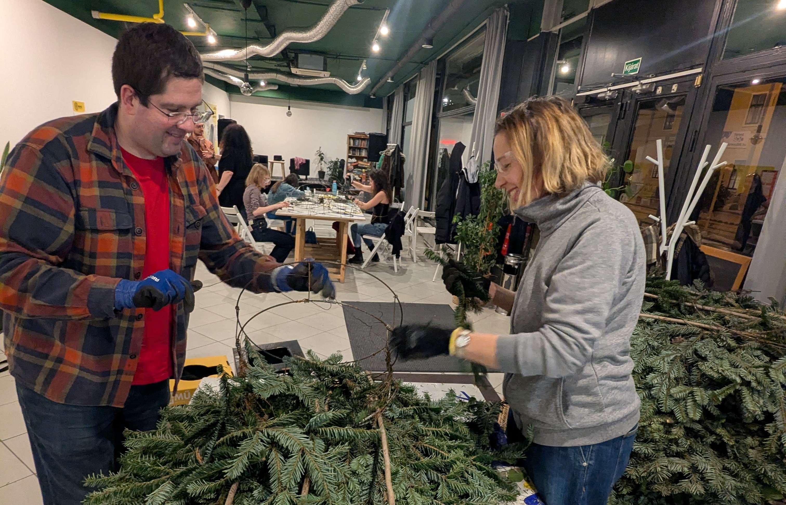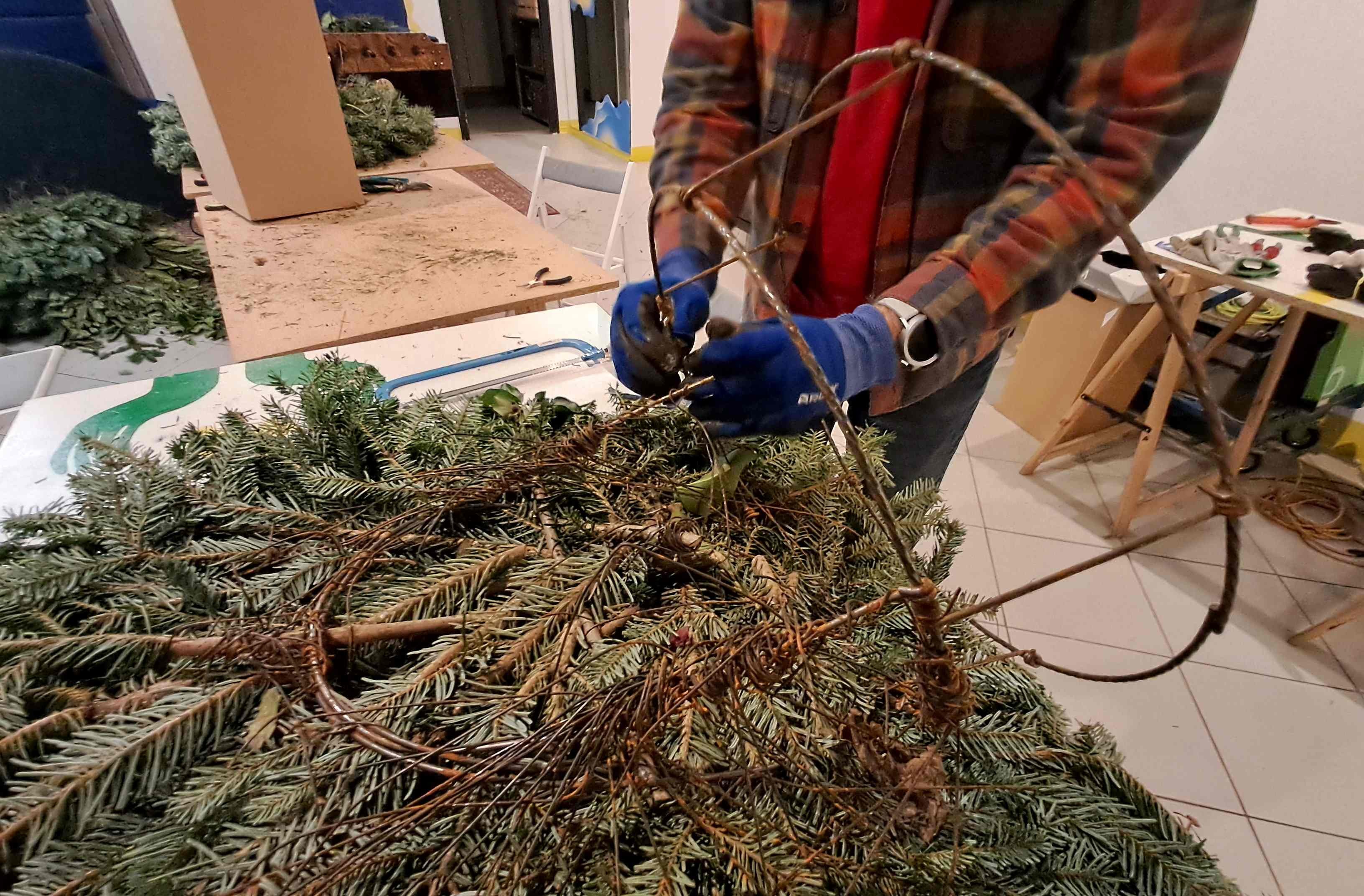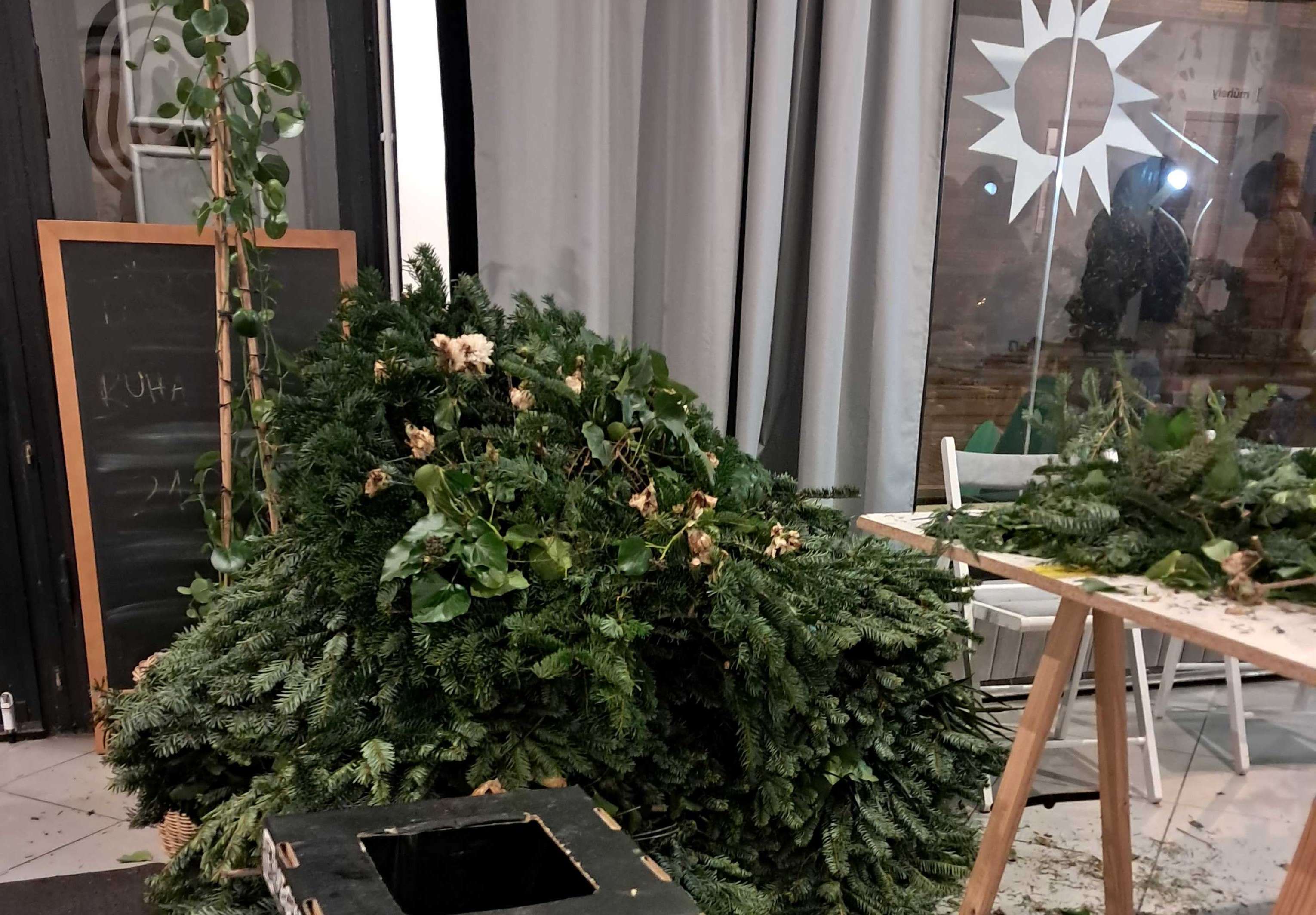 Kíváncsi voltam milyen egy ilyen csalifészek, és mennyi munka elkészíteni, ezért én is beálltam önkéntesnek. A Bolygóban szólt a zene, az asztalokra ki voltak készítve a fogók, kesztyűk, drótok, a levegőt pedig betöltötte a fenyőillat. A belső műhely tele volt hatalmas állókoszorúkkal. Ez volt az első meglepetés, mert a telefonbeszélgetések alapján én inkább kör alakú moha vagy szalmakoszorúkat képzeltem el.